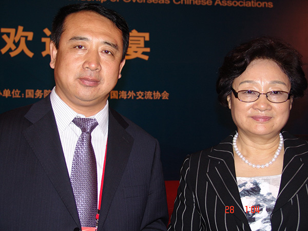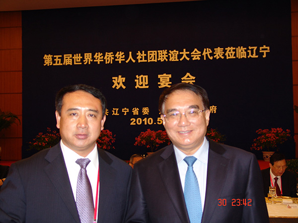 在大连市欢迎晚宴上,商会会长关百新与大连市市长李万才共同呼吁与会代表携手合作,共同为建设和谐侨社、和谐中国、和谐世界作出新贡献。商会会长关百新(右)、大连市市长李万才(左)。