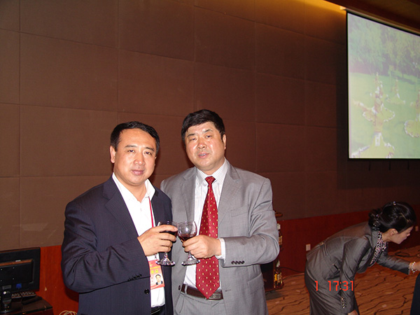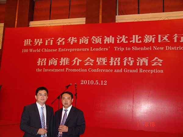 沈阳市沈北新区人民政府区长,沈阳蒲河新城管委会主任李鹏宇和关百新会长在世界百名华商领袖沈北新区行考察活动中,招商推介会暨招待酒会上,共同祝愿祖国繁荣昌盛。沈阳市沈北新区人民政府区长,沈阳蒲河新城管委会主任李鹏宇(左),关百新会长(右)。